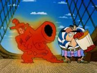 Стреляющий очередями из пушки с рук пират — пародия на фильм «Рэмбо» с Сильвестром Сталлоне в главной роли.