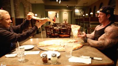 В ролике показано какая жирная начинка была. А 2 кг пиццы сьесть - не каждому по плечу.
