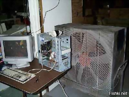 Вот эта идея у меня витает уже давно в отношении второго компа, на котором я только Хауса смотрю, "гоняя" на велотренажёре. Комната один фиг не отремонтирована, комп используется 1 час в день 5 дней в неделю, ещё бы только ЭЛТ на LCD сменить, и можно всё вешать. И стол освободится :)
