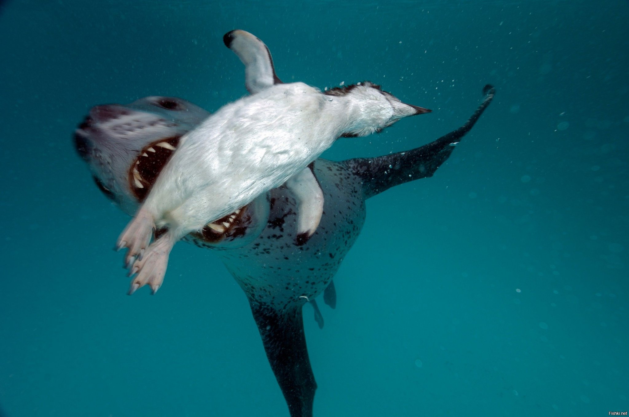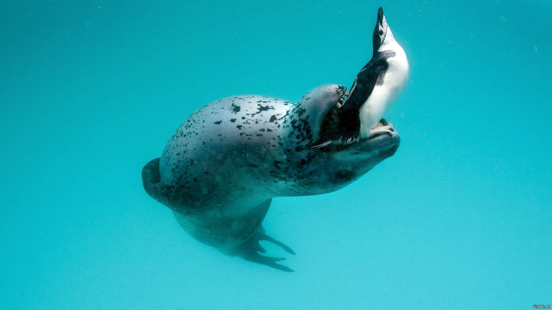Морской леопард спешит на помощь к тонущему пингвину.