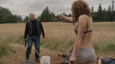 Если про тётку, которая метает нож, то это сериал "Холистическое детективное агентство Дирка Джентли" (Holistic). А конкретно этот эпизод из 5-й серии.