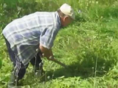 На фото женщина с косой-горбушей. Этот древний инструмент редко. Это что-то среднее между "большим"серпом и обыкновенной косой-литовкой.