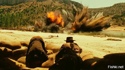 По ходу сюжета Блондин и Туко взрывают мост чтобы остановить бой)))