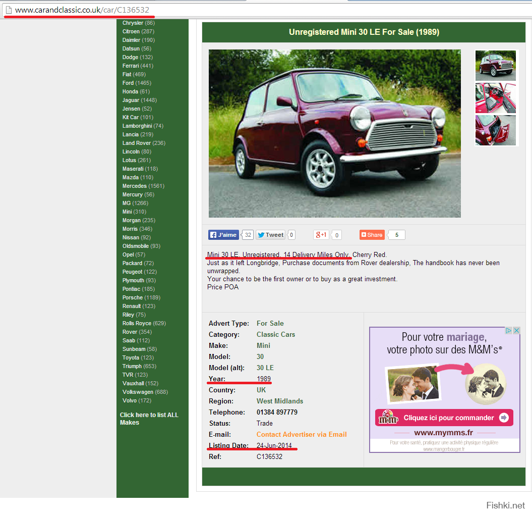 Необычный лот был выставлен на продажу в Англии. И дело даже не в том, что продающийся Mini Cooper 1989 года был выпущен в ограниченной серии к 30-летию модели.