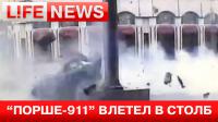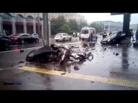 По Большой Якиманке едут машины, самого Porsche в кадре нет — на записи видно, как части машины после столкновения со столбом вылетают на трассу и разлетаются на несколько метров.